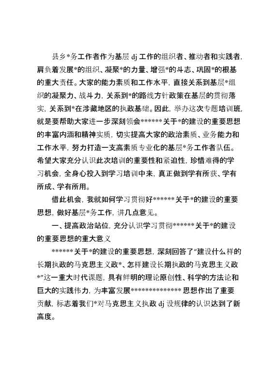 在全州学习贯彻XX关于党的建设的重要思想县乡党务工作者专题培训班开班式上的讲话 2025-01-24 Word模板 93 购买前,请一定要先点击这里看看,欢迎持续关注,精彩模板每天推送 预览结束,本文件为word文档,一共8页,共3415字,请购买后,下载后查看 购买前,请一定要先点击这里看看,欢迎持续关注,精彩模板每天推送 资源下载下载价格29 RMBVIP免费升级VIP点击检测网盘有效后购买有任何充值和下载问题请加微信:xuexixuexi66 0 演讲发言