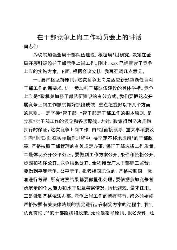 在干部竞争上岗工作动员会上的讲话 2025-01-24 Word模板 122 购买前,请一定要先点击这里看看,欢迎持续关注,精彩模板每天推送 预览结束,本文件为word文档,一共4页,共1789字,请购买后,下载后查看 购买前,请一定要先点击这里看看,欢迎持续关注,精彩模板每天推送 资源下载下载价格29 RMBVIP免费升级VIP点击检测网盘有效后购买有任何充值和下载问题请加微信:xuexixuexi66 0 演讲发言