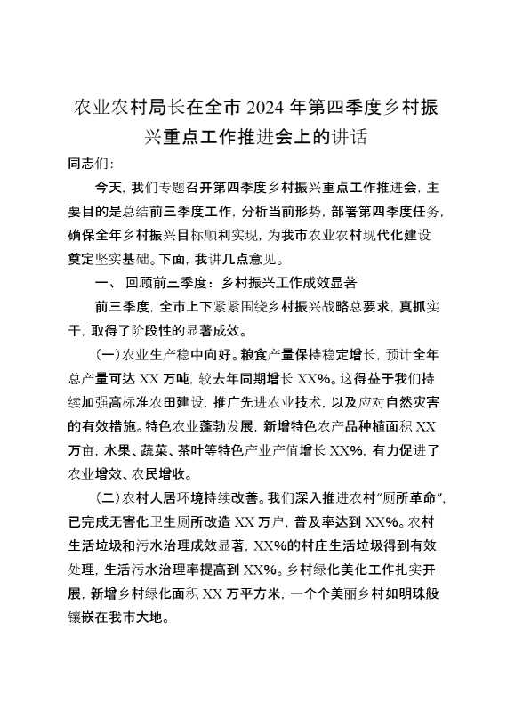 农业农村局长在全市2024年第四季度乡村振兴重点工作推进会上的讲话 2025-01-24 Word模板 81 购买前,请一定要先点击这里看看,欢迎持续关注,精彩模板每天推送 预览结束,本文件为word文档,一共6页,共2893字,请购买后,下载后查看 购买前,请一定要先点击这里看看,欢迎持续关注,精彩模板每天推送 资源下载下载价格29 RMBVIP免费升级VIP点击检测网盘有效后购买有任何充值和下载问题请加微信:xuexixuexi66 0 演讲发言