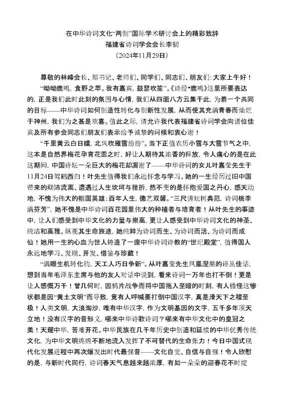 福建省诗词学会会长李韧:在中华诗词文化“两创”国际学术研讨会上的精彩致辞 2025-01-27 Word模板 74 购买前,请一定要先点击这里看看,欢迎持续关注,精彩模板每天推送 预览结束,本文件为word文档,一共2页,共1441字,请购买后,下载后查看 购买前,请一定要先点击这里看看,欢迎持续关注,精彩模板每天推送 资源下载下载价格29 RMBVIP免费升级VIP点击检测网盘有效后购买有任何充值和下载问题请加微信:xuexixuexi66 0 演讲发言
