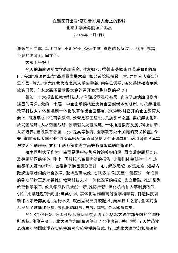 北京大学常务副校长乔杰:在海医再出发 高质量发展大会上的致辞 2025-01-27 Word模板 71 购买前,请一定要先点击这里看看,欢迎持续关注,精彩模板每天推送 预览结束,本文件为word文档,一共2页,共1224字,请购买后,下载后查看 购买前,请一定要先点击这里看看,欢迎持续关注,精彩模板每天推送 资源下载下载价格29 RMBVIP免费升级VIP点击检测网盘有效后购买有任何充值和下载问题请加微信:xuexixuexi66 0 演讲发言