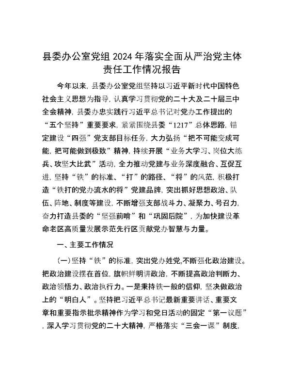县委办公室党组2024年落实全面从严治党主体责任工作情况报告 2025-01-27 Word模板 69 购买前,请一定要先点击这里看看,欢迎持续关注,精彩模板每天推送 预览结束,本文件为word文档,一共7页,共3128字,请购买后,下载后查看 购买前,请一定要先点击这里看看,欢迎持续关注,精彩模板每天推送 资源下载下载价格29 RMBVIP免费升级VIP点击检测网盘有效后购买有任何充值和下载问题请加微信:xuexixuexi66 0 总结汇报