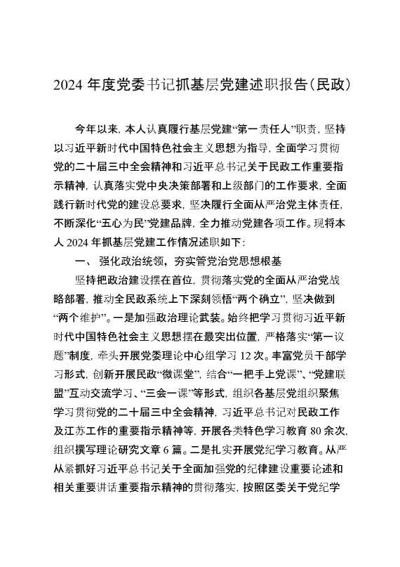 2024年度党委书记抓基层党建述职报告(民政) 2025-02-06 Word模板 83 购买前,请一定要先点击这里看看,欢迎持续关注,精彩模板每天推送 预览结束,本文件为word文档,一共7页,共3400字,请购买后,下载后查看 购买前,请一定要先点击这里看看,欢迎持续关注,精彩模板每天推送 资源下载下载价格29 RMBVIP免费升级VIP点击检测网盘有效后购买有任何充值和下载问题请加微信:xuexixuexi66 0 总结汇报