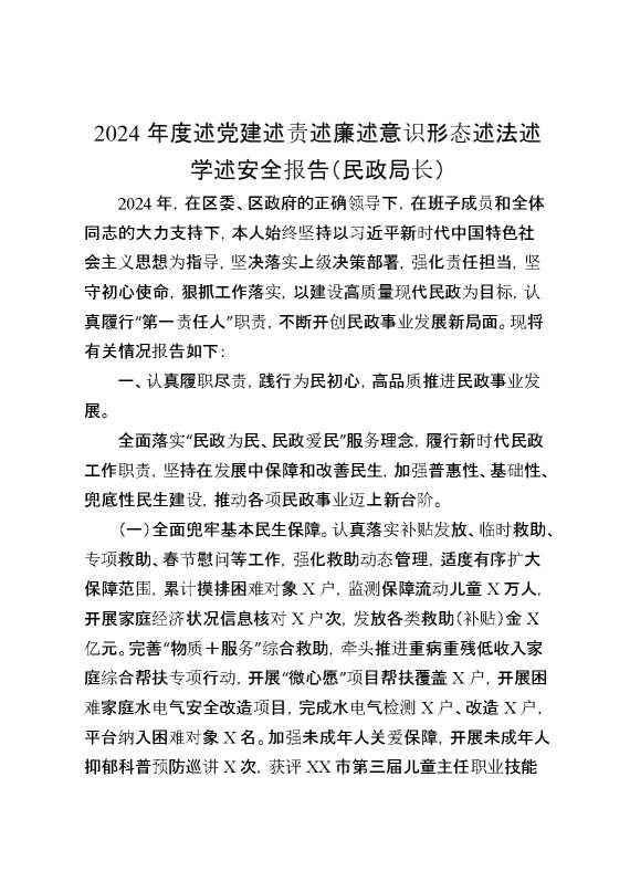 2024年度述党建述责述廉述意识形态述法述学述安全报告(民政局长) 2025-02-06 Word模板 83 购买前,请一定要先点击这里看看,欢迎持续关注,精彩模板每天推送 预览结束,本文件为word文档,一共6页,共3008字,请购买后,下载后查看 购买前,请一定要先点击这里看看,欢迎持续关注,精彩模板每天推送 资源下载下载价格29 RMBVIP免费升级VIP点击检测网盘有效后购买有任何充值和下载问题请加微信:xuexixuexi66 0 总结汇报