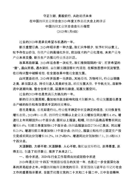 中国纺织工业联合会会长孙瑞哲:在中国纺织工业联合会2024年度工作总结大会上的讲话 2025-02-27 Word模板 80 购买前,请一定要先点击这里看看,欢迎持续关注,精彩模板每天推送 预览结束,本文件为word文档,一共28页,共22961字,请购买后,下载后查看 购买前,请一定要先点击这里看看,欢迎持续关注,精彩模板每天推送 资源下载下载价格29 RMBVIP免费升级VIP点击检测网盘有效后购买有任何充值和下载问题请加微信:xuexixuexi66 0 演讲发言
