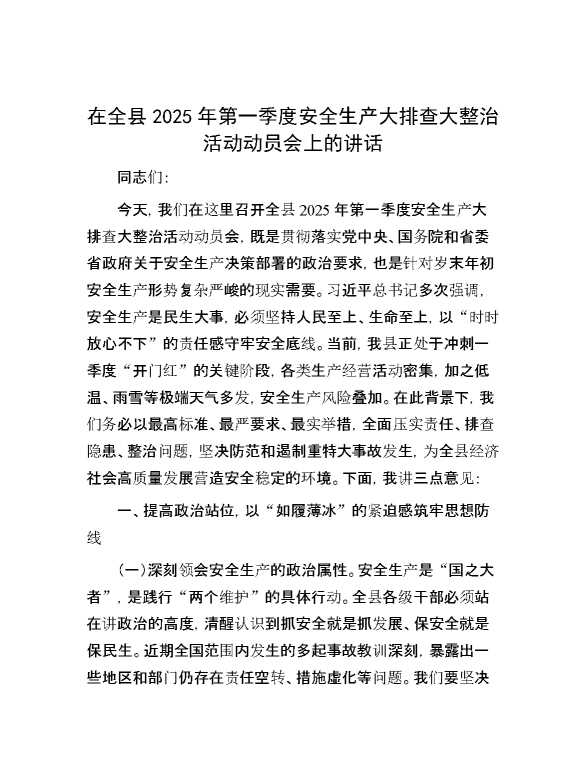 在全县2025年第一季度安全生产大排查大整治活动动员会上的讲话 2025-03-07 Word模板 73 购买前,请一定要先点击这里看看,欢迎持续关注,精彩模板每天推送 预览结束,本文件为word文档,一共4页,共1642字,请购买后,下载后查看 购买前,请一定要先点击这里看看,欢迎持续关注,精彩模板每天推送 资源下载下载价格29 RMBVIP免费升级VIP点击检测网盘有效后购买有任何充值和下载问题请加微信:xuexixuexi66 0 演讲发言