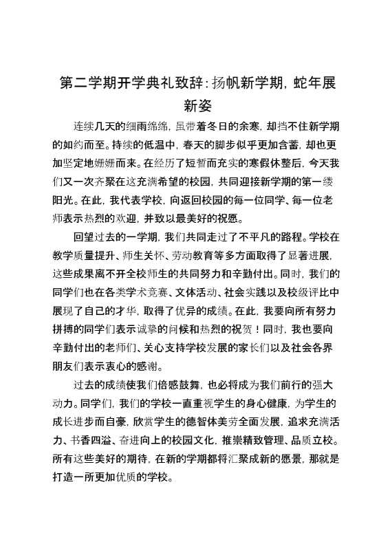 第二学期开学典礼致辞:扬帆新学期,蛇年展新姿 2025-03-18 Word模板 69 购买前,请一定要先点击这里看看,欢迎持续关注,精彩模板每天推送 预览结束,本文件为word文档,一共3页,共1121字,请购买后,下载后查看 购买前,请一定要先点击这里看看,欢迎持续关注,精彩模板每天推送 资源下载下载价格29 RMBVIP免费升级VIP立即购买有任何充值和下载问题请加微信:xuexixuexi66 0 演讲发言