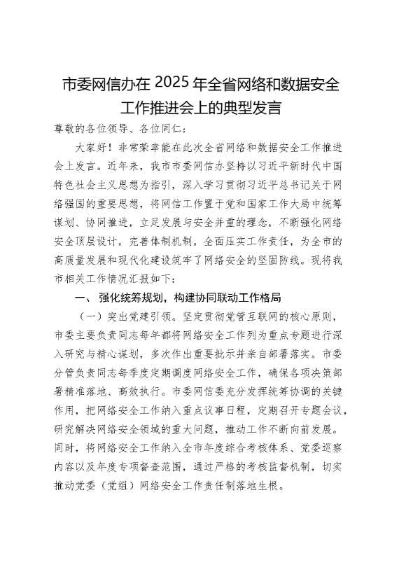 市委网信办在2025年全省网络和数据安全工作推进会上的典型发言 2025-03-18 Word模板 67 购买前,请一定要先点击这里看看,欢迎持续关注,精彩模板每天推送 预览结束,本文件为word文档,一共6页,共2876字,请购买后,下载后查看 购买前,请一定要先点击这里看看,欢迎持续关注,精彩模板每天推送 资源下载下载价格29 RMBVIP免费升级VIP点击检测网盘有效后购买有任何充值和下载问题请加微信:xuexixuexi66 0 演讲发言