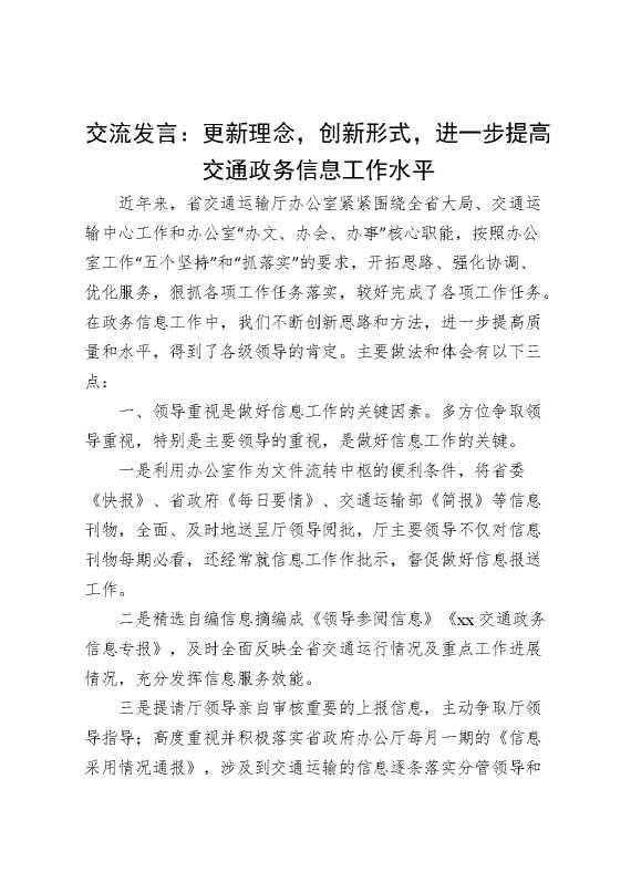 交流发言:更新理念,创新形式,进一步提高交通政务信息工作水平 2025-04-07 Word模板 61 购买前,请一定要先点击这里看看,欢迎持续关注,精彩模板每天推送 预览结束,本文件为word文档,一共4页,共1855字,请购买后,下载后查看 购买前,请一定要先点击这里看看,欢迎持续关注,精彩模板每天推送 资源下载下载价格29 RMBVIP免费升级VIP立即购买有任何充值和下载问题请加微信:xuexixuexi66 0 演讲发言