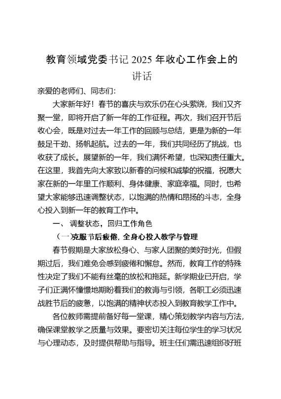 教育领域党委书记2025年收心工作会上的讲话 2025-04-07 Word模板 63 购买前,请一定要先点击这里看看,欢迎持续关注,精彩模板每天推送 预览结束,本文件为word文档,一共10页,共4376字,请购买后,下载后查看 购买前,请一定要先点击这里看看,欢迎持续关注,精彩模板每天推送 资源下载下载价格29 RMBVIP免费升级VIP点击检测网盘有效后购买有任何充值和下载问题请加微信:xuexixuexi66 0 演讲发言