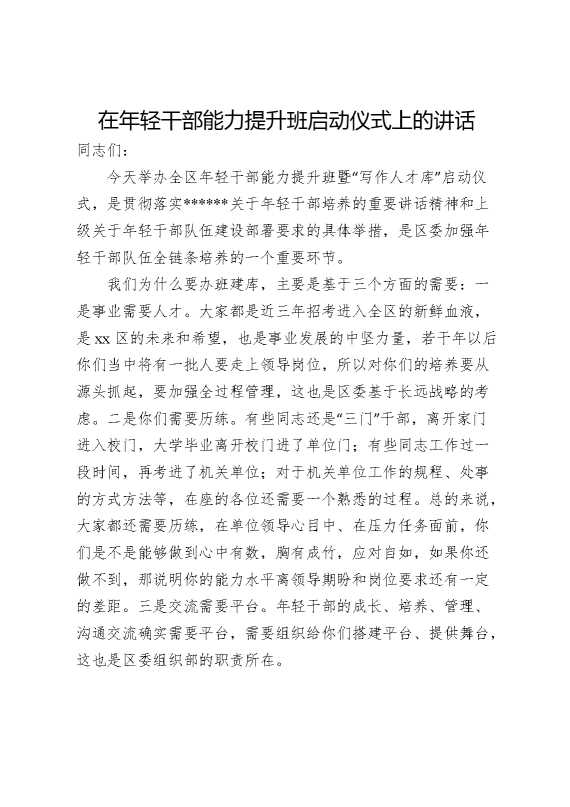 年轻干部能力提升班启动仪式上的讲话 2025-04-07 Word模板 62 购买前,请一定要先点击这里看看,欢迎持续关注,精彩模板每天推送 预览结束,本文件为word文档,一共12页,共5597字,请购买后,下载后查看 购买前,请一定要先点击这里看看,欢迎持续关注,精彩模板每天推送 资源下载下载价格29 RMBVIP免费升级VIP点击检测网盘有效后购买有任何充值和下载问题请加微信:xuexixuexi66 0 演讲发言