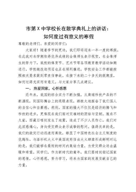 市第某中学校长在散学典礼上的讲话:如何度过有意义的寒假 2025-04-07 Word模板 62 购买前,请一定要先点击这里看看,欢迎持续关注,精彩模板每天推送 预览结束,本文件为word文档,一共3页,共1162字,请购买后,下载后查看 购买前,请一定要先点击这里看看,欢迎持续关注,精彩模板每天推送 资源下载下载价格29 RMBVIP免费升级VIP点击检测网盘有效后购买有任何充值和下载问题请加微信:xuexixuexi66 0 演讲发言