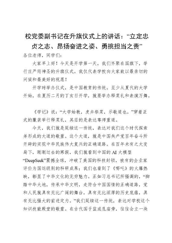 校党委副书记在升旗仪式上的讲话:“立定忠贞之志、昂扬奋进之姿、勇挑担当之责” 2025-04-07 Word模板 98 购买前,请一定要先点击这里看看,欢迎持续关注,精彩模板每天推送 预览结束,本文件为word文档,一共4页,共1915字,请购买后,下载后查看 购买前,请一定要先点击这里看看,欢迎持续关注,精彩模板每天推送 资源下载下载价格29 RMBVIP免费升级VIP点击检测网盘有效后购买有任何充值和下载问题请加微信:xuexixuexi66 0 演讲发言