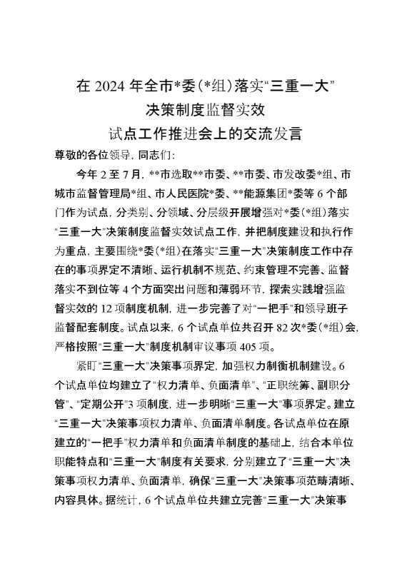在2024年全市落实“三重一大”决策制度监督实效试点工作推进会上的交流发言 2025-04-07 Word模板 60 购买前,请一定要先点击这里看看,欢迎持续关注,精彩模板每天推送 预览结束,本文件为word文档,一共4页,共1777字,请购买后,下载后查看 购买前,请一定要先点击这里看看,欢迎持续关注,精彩模板每天推送 资源下载下载价格29 RMBVIP免费升级VIP点击检测网盘有效后购买有任何充值和下载问题请加微信:xuexixuexi66 0 演讲发言