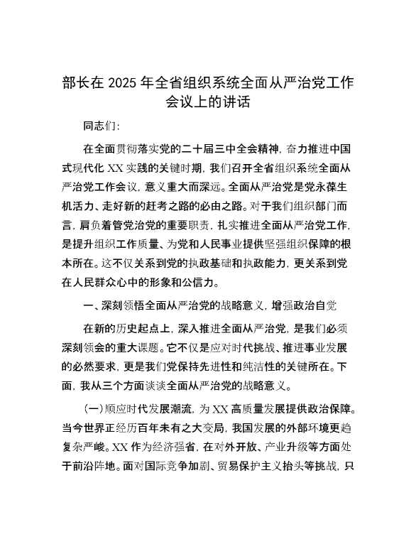 部长在2025年全省组织系统全面从严治党工作会议上的讲话 2025-04-23 Word模板 57 购买前,请一定要先点击这里看看,欢迎持续关注,精彩模板每天推送 预览结束,本文件为word文档,一共12页,共6084字,请购买后,下载后查看 购买前,请一定要先点击这里看看,欢迎持续关注,精彩模板每天推送 资源下载下载价格29 RMBVIP免费升级VIP点击检测网盘有效后购买有任何充值和下载问题请加微信:xuexixuexi66 0 演讲发言