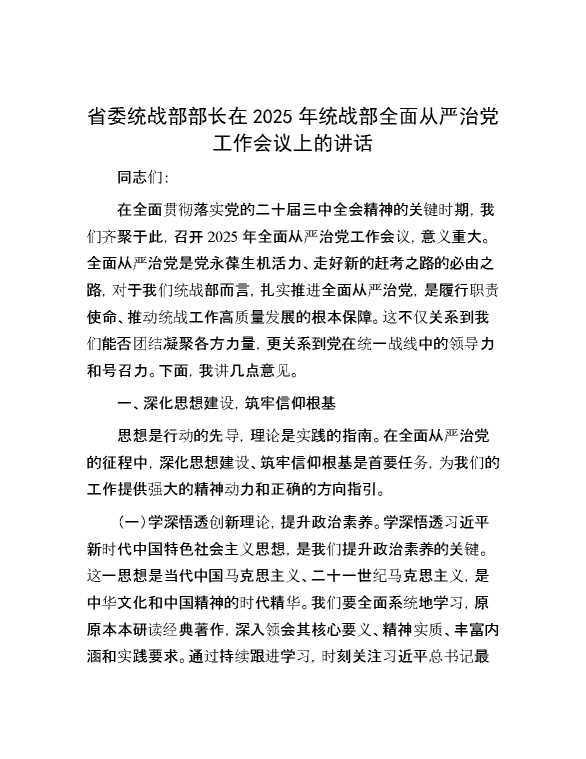 省委统战部部长在2025年统战部全面从严治党工作会议上的讲话 2025-04-23 Word模板 57 购买前,请一定要先点击这里看看,欢迎持续关注,精彩模板每天推送 预览结束,本文件为word文档,一共16页,共8031字,请购买后,下载后查看 购买前,请一定要先点击这里看看,欢迎持续关注,精彩模板每天推送 资源下载下载价格29 RMBVIP免费升级VIP点击检测网盘有效后购买有任何充值和下载问题请加微信:xuexixuexi66 0 演讲发言