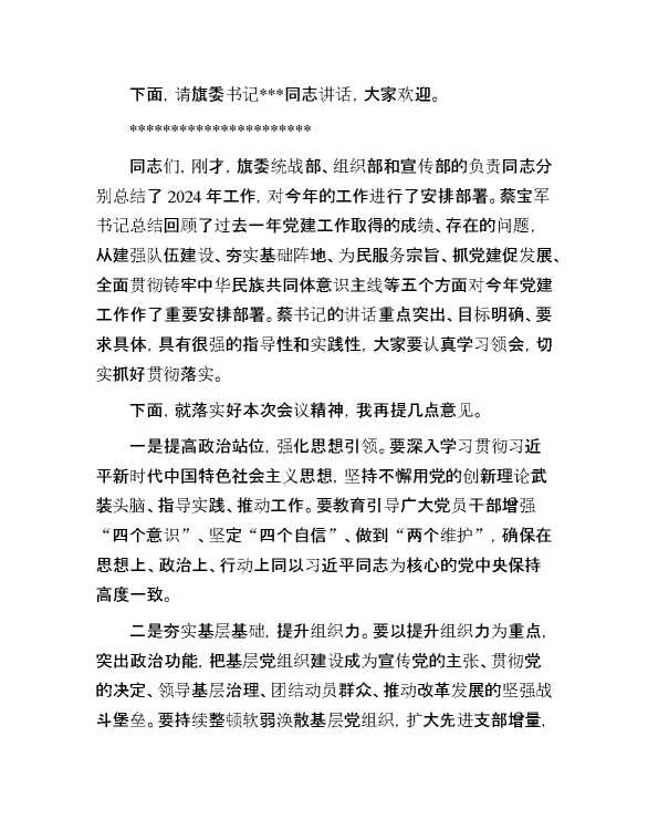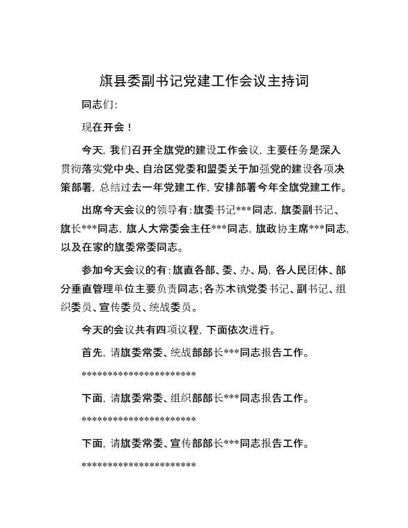 旗县委副书记党建工作会议主持词 2025-04-23 Word模板 48 购买前,请一定要先点击这里看看,欢迎持续关注,精彩模板每天推送 预览结束,本文件为word文档,一共4页,共1284字,请购买后,下载后查看 购买前,请一定要先点击这里看看,欢迎持续关注,精彩模板每天推送 资源下载下载价格29 RMBVIP免费升级VIP点击检测网盘有效后购买有任何充值和下载问题请加微信:xuexixuexi66 0 演讲发言