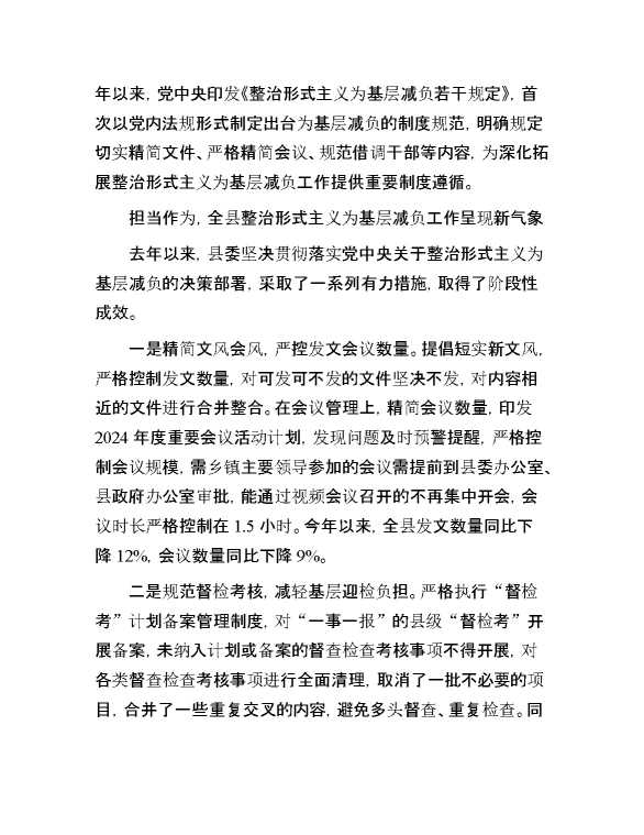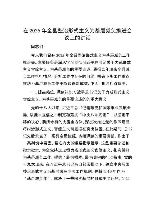 在2025年全县整治形式主义为基层减负推进会议上的讲话 2025-04-23 Word模板 55 购买前,请一定要先点击这里看看,欢迎持续关注,精彩模板每天推送 预览结束,本文件为word文档,一共6页,共2570字,请购买后,下载后查看 购买前,请一定要先点击这里看看,欢迎持续关注,精彩模板每天推送 资源下载下载价格29 RMBVIP免费升级VIP点击检测网盘有效后购买有任何充值和下载问题请加微信:xuexixuexi66 0 演讲发言
