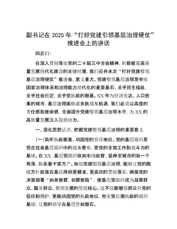 副书记在2025年“打好党建引领基层治理硬仗”推进会上的讲话 2025-04-23 Word模板 56 购买前,请一定要先点击这里看看,欢迎持续关注,精彩模板每天推送 预览结束,本文件为word文档,一共9页,共4419字,请购买后,下载后查看 购买前,请一定要先点击这里看看,欢迎持续关注,精彩模板每天推送 资源下载下载价格29 RMBVIP免费升级VIP点击检测网盘有效后购买有任何充值和下载问题请加微信:xuexixuexi66 0 演讲发言