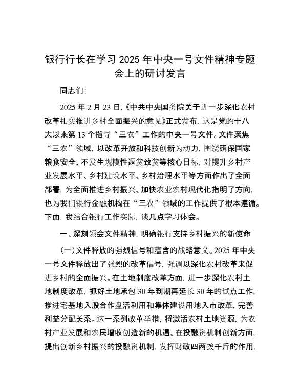 银行行长在学习2025年中央一号文件精神专题会上的研讨发言 2025-04-23 Word模板 53 购买前,请一定要先点击这里看看,欢迎持续关注,精彩模板每天推送 预览结束,本文件为word文档,一共12页,共6192字,请购买后,下载后查看 购买前,请一定要先点击这里看看,欢迎持续关注,精彩模板每天推送 资源下载下载价格29 RMBVIP免费升级VIP点击检测网盘有效后购买有任何充值和下载问题请加微信:xuexixuexi66 0 演讲发言