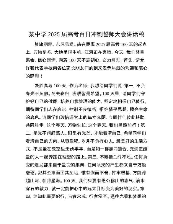 某中学2025届高考百日冲刺誓师大会讲话稿 2025-04-23 Word模板 51 购买前,请一定要先点击这里看看,欢迎持续关注,精彩模板每天推送 预览结束,本文件为word文档,一共4页,共1567字,请购买后,下载后查看 购买前,请一定要先点击这里看看,欢迎持续关注,精彩模板每天推送 资源下载下载价格29 RMBVIP免费升级VIP点击检测网盘有效后购买有任何充值和下载问题请加微信:xuexixuexi66 0 演讲发言