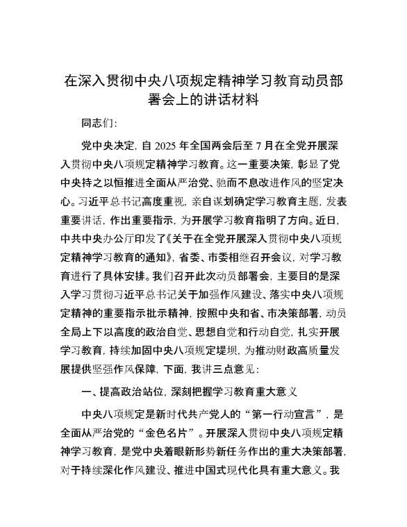 在深入贯彻中央八项规定精神学习教育动员部署会上的讲话材料 2025-04-24 Word模板 73 购买前,请一定要先点击这里看看,欢迎持续关注,精彩模板每天推送 预览结束,本文件为word文档,一共6页,共2701字,请购买后,下载后查看 购买前,请一定要先点击这里看看,欢迎持续关注,精彩模板每天推送 资源下载下载价格29 RMBVIP免费升级VIP点击检测网盘有效后购买有任何充值和下载问题请加微信:xuexixuexi66 0 演讲发言