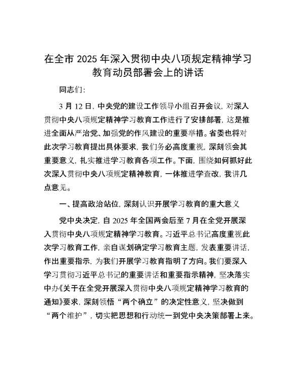 在全市2025年深入贯彻中央八项规定精神学习教育动员部署会上的讲话 2025-04-24 Word模板 84 购买前,请一定要先点击这里看看,欢迎持续关注,精彩模板每天推送 预览结束,本文件为word文档,一共7页,共3001字,请购买后,下载后查看 购买前,请一定要先点击这里看看,欢迎持续关注,精彩模板每天推送 资源下载下载价格29 RMBVIP免费升级VIP点击检测网盘有效后购买有任何充值和下载问题请加微信:xuexixuexi66 0 演讲发言