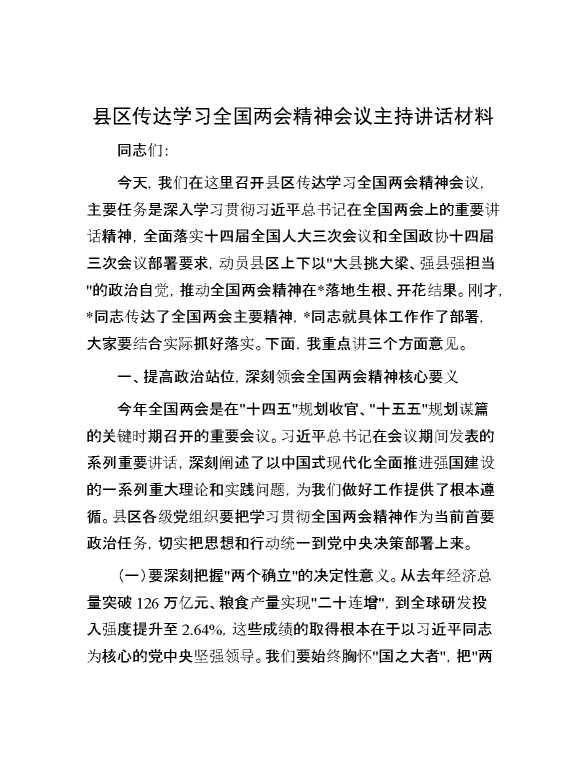 县区传达学习全国两会精神会议主持讲话材料 2025-04-24 Word模板 59 购买前,请一定要先点击这里看看,欢迎持续关注,精彩模板每天推送 预览结束,本文件为word文档,一共5页,共2286字,请购买后,下载后查看 购买前,请一定要先点击这里看看,欢迎持续关注,精彩模板每天推送 资源下载下载价格29 RMBVIP免费升级VIP点击检测网盘有效后购买有任何充值和下载问题请加微信:xuexixuexi66 0 演讲发言