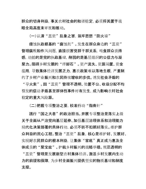 区委书记在农村“三资”管理专项整治动员部署会上的讲话:刀刃向内,重拳出击,坚决整治“三资”领域突出问题 2025-07-28 Word模板 32 购买前,请一定要先点击这里看看,欢迎持续关注,精彩模板每天推送 预览结束,本文件为word文档,一共14页,共6046字,请购买后,下载后查看 购买前,请一定要先点击这里看看,欢迎持续关注,精彩模板每天推送 资源下载下载价格29 RMBVIP免费升级VIP点击检测网盘有效后购买有任何充值和下载问题请加微信:xuexixuexi66 0 演讲发言