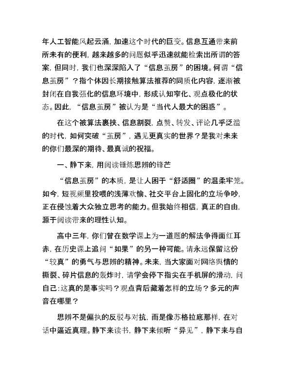 在中学2025届高三毕业典礼上的讲话:突破“茧房”,遇见更真实的世界 2025-07-28 Word模板 29 购买前,请一定要先点击这里看看,欢迎持续关注,精彩模板每天推送 预览结束,本文件为word文档,一共5页,共1989字,请购买后,下载后查看 购买前,请一定要先点击这里看看,欢迎持续关注,精彩模板每天推送 资源下载下载价格29 RMBVIP免费升级VIP点击检测网盘有效后购买有任何充值和下载问题请加微信:xuexixuexi66 0 演讲发言