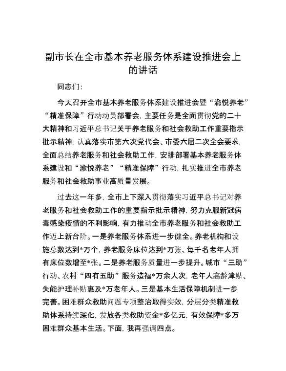 副市长在全市基本养老服务体系建设推进会上的讲话 2023-09-26 Word模板 127 购买前,请一定要先点击这里看看,欢迎持续关注,精彩模板每天推送 预览结束,本文件为word文档,一共8页,共3776字,请购买后,下载后查看 购买前,请一定要先点击这里看看,欢迎持续关注,精彩模板每天推送 资源下载下载价格29 RMBVIP免费升级VIP点击检测网盘有效后购买有任何充值和下载问题请加微信:xuexixuexi66 0 演讲发言