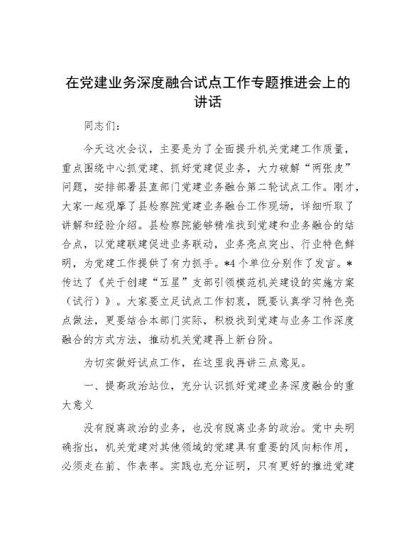 在党建业务深度融合试点工作专题推进会上的讲话 2023-11-27 Word模板 132 购买前,请一定要先点击这里看看,欢迎持续关注,精彩模板每天推送 预览结束,本文件为word文档,一共5页,共2425字,请购买后,下载后查看 购买前,请一定要先点击这里看看,欢迎持续关注,精彩模板每天推送 资源下载下载价格29 RMBVIP免费升级VIP点击检测网盘有效后购买有任何充值和下载问题请加微信:xuexixuexi66 0 演讲发言