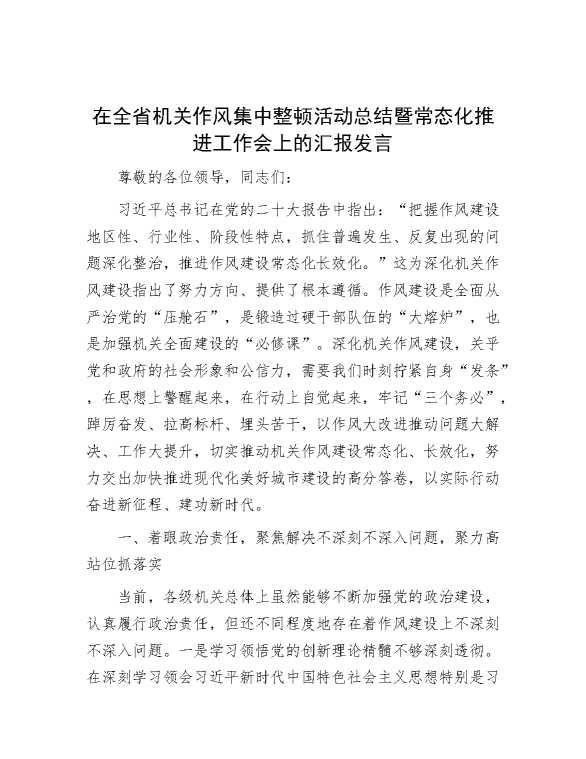 在全省机关作风集中整顿活动总结暨常态化推进工作会上的汇报发言 2023-11-27 Word模板 126 购买前,请一定要先点击这里看看,欢迎持续关注,精彩模板每天推送 预览结束,本文件为word文档,一共8页,共3581字,请购买后,下载后查看 购买前,请一定要先点击这里看看,欢迎持续关注,精彩模板每天推送 资源下载下载价格29 RMBVIP免费升级VIP点击检测网盘有效后购买有任何充值和下载问题请加微信:xuexixuexi66 0 演讲发言