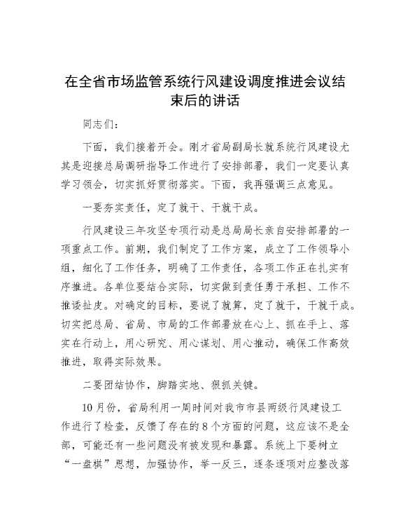 在全省市场监管系统行风建设调度推进会议结束后的讲话 2023-11-27 Word模板 128 购买前,请一定要先点击这里看看,欢迎持续关注,精彩模板每天推送 预览结束,本文件为word文档,一共3页,共954字,请购买后,下载后查看 购买前,请一定要先点击这里看看,欢迎持续关注,精彩模板每天推送 资源下载下载价格29 RMBVIP免费升级VIP点击检测网盘有效后购买有任何充值和下载问题请加微信:xuexixuexi66 0 演讲发言