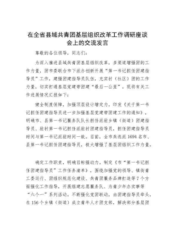 在全省县域共青团基层组织改革工作调研座谈会上的交流发言 2023-11-27 Word模板 113 购买前,请一定要先点击这里看看,欢迎持续关注,精彩模板每天推送 预览结束,本文件为word文档,一共4页,共1564字,请购买后,下载后查看 购买前,请一定要先点击这里看看,欢迎持续关注,精彩模板每天推送 资源下载下载价格29 RMBVIP免费升级VIP点击检测网盘有效后购买有任何充值和下载问题请加微信:xuexixuexi66 0 演讲发言