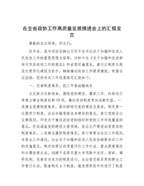 在全省政协工作高质量发展推进会上的汇报发言 2023-11-27 Word模板 107 购买前,请一定要先点击这里看看,欢迎持续关注,精彩模板每天推送 预览结束,本文件为word文档,一共3页,共1267字,请购买后,下载后查看 购买前,请一定要先点击这里看看,欢迎持续关注,精彩模板每天推送 资源下载下载价格29 RMBVIP免费升级VIP点击检测网盘有效后购买有任何充值和下载问题请加微信:xuexixuexi66 0 演讲发言