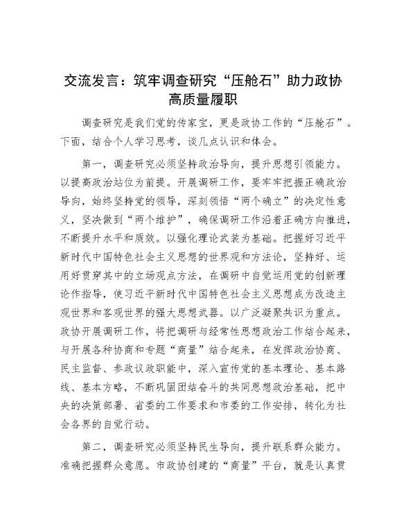 交流发言:筑牢调查研究“压舱石” 助力政协高质量履职 2023-12-03 Word模板 103 购买前,请一定要先点击这里看看,欢迎持续关注,精彩模板每天推送 预览结束,本文件为word文档,一共3页,共1017字,请购买后,下载后查看 购买前,请一定要先点击这里看看,欢迎持续关注,精彩模板每天推送 资源下载下载价格29 RMBVIP免费升级VIP点击检测网盘有效后购买有任何充值和下载问题请加微信:xuexixuexi66 0 演讲发言