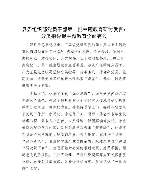 县委组织部党员干部第二批主题教育研讨发言:分类指导促主题教育全面有效 2023-12-03 Word模板 108 购买前,请一定要先点击这里看看,欢迎持续关注,精彩模板每天推送 预览结束,本文件为word文档,一共3页,共986字,请购买后,下载后查看 购买前,请一定要先点击这里看看,欢迎持续关注,精彩模板每天推送 资源下载下载价格29 RMBVIP免费升级VIP点击检测网盘有效后购买有任何充值和下载问题请加微信:xuexixuexi66 0 演讲发言
