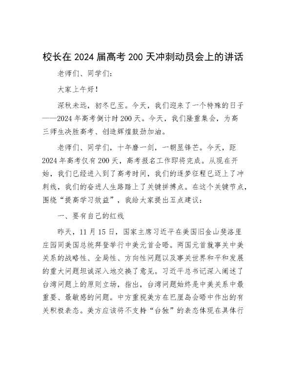 校长在2024届高考200天冲刺动员会上的讲话 2023-12-03 Word模板 104 购买前,请一定要先点击这里看看,欢迎持续关注,精彩模板每天推送 预览结束,本文件为word文档,一共4页,共1652字,请购买后,下载后查看 购买前,请一定要先点击这里看看,欢迎持续关注,精彩模板每天推送 资源下载下载价格29 RMBVIP免费升级VIP点击检测网盘有效后购买有任何充值和下载问题请加微信:xuexixuexi66 0 演讲发言