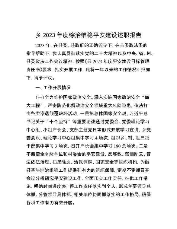 乡2023年度综治维稳平安建设述职报告 2023-12-07 Word模板 112 购买前,请一定要先点击这里看看,欢迎持续关注,精彩模板每天推送 预览结束,本文件为word文档,一共9页,共4030字,请购买后,下载后查看 购买前,请一定要先点击这里看看,欢迎持续关注,精彩模板每天推送 资源下载下载价格29 RMBVIP免费升级VIP点击检测网盘有效后购买有任何充值和下载问题请加微信:xuexixuexi66 0 总结汇报