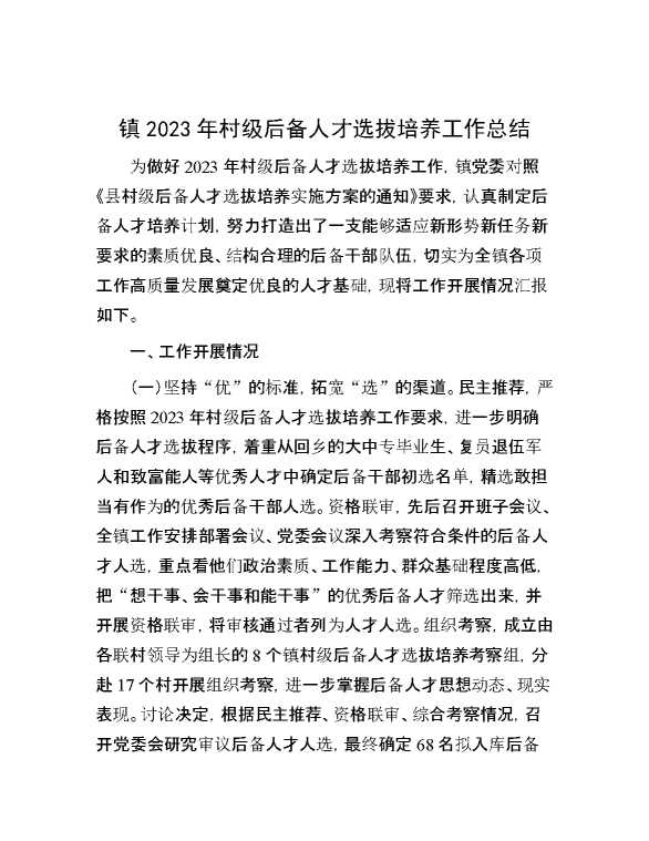镇2023年村级后备人才选拔培养工作总结 2023-12-07 Word模板 122 购买前,请一定要先点击这里看看,欢迎持续关注,精彩模板每天推送 预览结束,本文件为word文档,一共3页,共1224字,请购买后,下载后查看 购买前,请一定要先点击这里看看,欢迎持续关注,精彩模板每天推送 资源下载下载价格29 RMBVIP免费升级VIP点击检测网盘有效后购买有任何充值和下载问题请加微信:xuexixuexi66 0 总结汇报