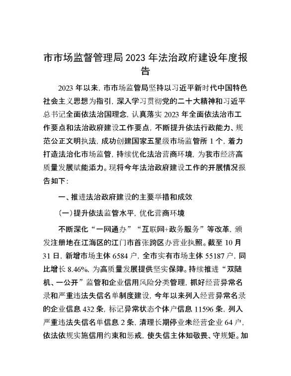市市场监督管理局2023年法治政府建设年度报告 2023-12-16 Word模板 114 购买前,请一定要先点击这里看看,欢迎持续关注,精彩模板每天推送 预览结束,本文件为word文档,一共8页,共3692字,请购买后,下载后查看 购买前,请一定要先点击这里看看,欢迎持续关注,精彩模板每天推送 资源下载下载价格29 RMBVIP免费升级VIP点击检测网盘有效后购买有任何充值和下载问题请加微信:xuexixuexi66 0 总结汇报