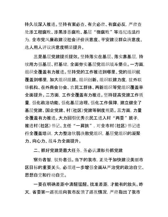 市委书记在县(市、区)党委书记落实主体责任述职评议会议、全市机关党的建设工作会议上的讲话 2023-12-16 Word模板 106 购买前,请一定要先点击这里看看,欢迎持续关注,精彩模板每天推送 预览结束,本文件为word文档,一共13页,共6283字,请购买后,下载后查看 购买前,请一定要先点击这里看看,欢迎持续关注,精彩模板每天推送 资源下载下载价格29 RMBVIP免费升级VIP点击检测网盘有效后购买有任何充值和下载问题请加微信:xuexixuexi66 0 演讲发言
