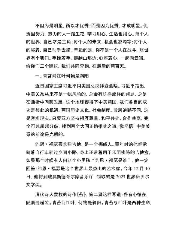 校长在2024高考倒计时200天冲刺励志活动上的讲话 2023-12-16 Word模板 130 购买前,请一定要先点击这里看看,欢迎持续关注,精彩模板每天推送 预览结束,本文件为word文档,一共6页,共2804字,请购买后,下载后查看 购买前,请一定要先点击这里看看,欢迎持续关注,精彩模板每天推送 资源下载下载价格29 RMBVIP免费升级VIP点击检测网盘有效后购买有任何充值和下载问题请加微信:xuexixuexi66 0 演讲发言
