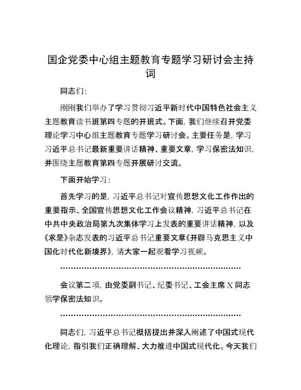 国企党委中心组主题教育专题学习研讨会主持词 2023-12-16 Word模板 153 购买前,请一定要先点击这里看看,欢迎持续关注,精彩模板每天推送 预览结束,本文件为word文档,一共4页,共1394字,请购买后,下载后查看 购买前,请一定要先点击这里看看,欢迎持续关注,精彩模板每天推送 资源下载下载价格29 RMBVIP免费升级VIP点击检测网盘有效后购买有任何充值和下载问题请加微信:xuexixuexi66 0 党课及生活会