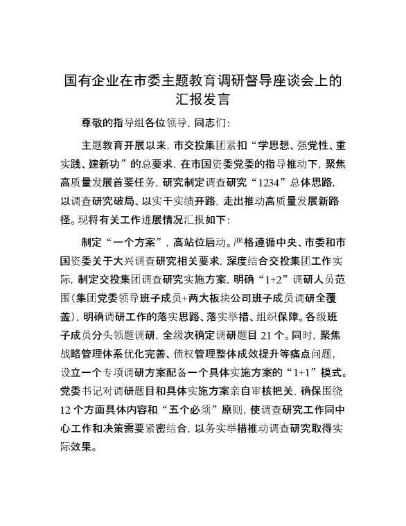 国有企业在市委主题教育调研督导座谈会上的汇报发言 2023-12-16 Word模板 162 购买前,请一定要先点击这里看看,欢迎持续关注,精彩模板每天推送 预览结束,本文件为word文档,一共6页,共2865字,请购买后,下载后查看 购买前,请一定要先点击这里看看,欢迎持续关注,精彩模板每天推送 资源下载下载价格29 RMBVIP免费升级VIP点击检测网盘有效后购买有任何充值和下载问题请加微信:xuexixuexi66 0 党课及生活会