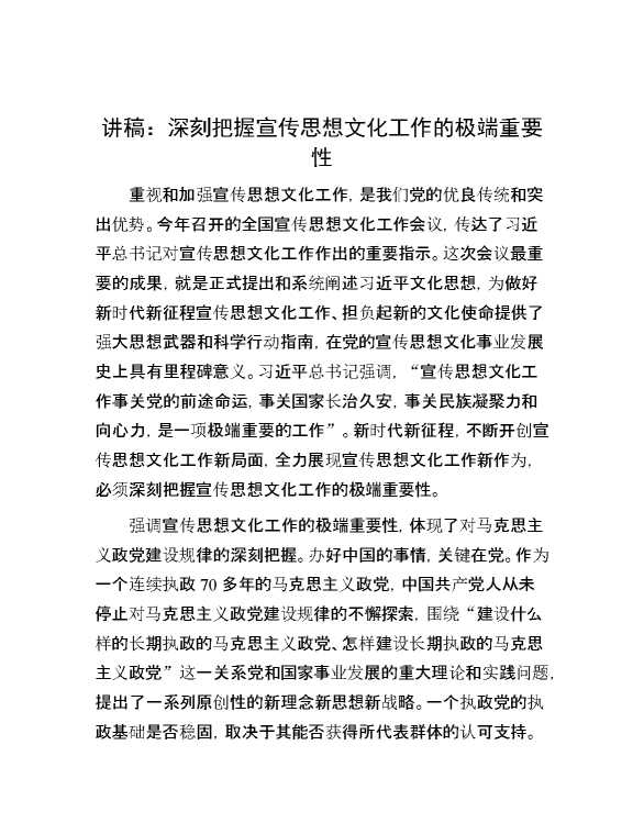 讲稿:深刻把握宣传思想文化工作的极端重要性 2023-12-16 Word模板 118 购买前,请一定要先点击这里看看,欢迎持续关注,精彩模板每天推送 预览结束,本文件为word文档,一共6页,共2740字,请购买后,下载后查看 购买前,请一定要先点击这里看看,欢迎持续关注,精彩模板每天推送 资源下载下载价格29 RMBVIP免费升级VIP点击检测网盘有效后购买有任何充值和下载问题请加微信:xuexixuexi66 0 党课及生活会