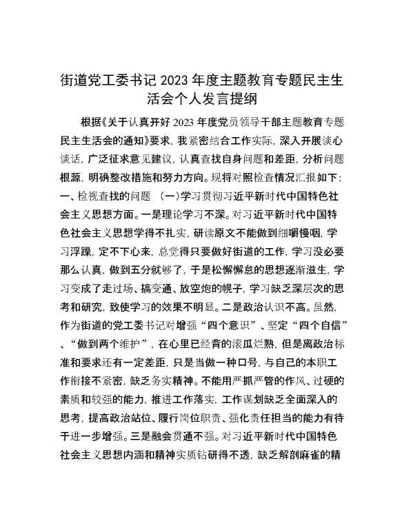 街道党工委书记2023年度主题教育专题民主生活会个人发言提纲 2024-01-11 Word模板 125 购买前,请一定要先点击这里看看,欢迎持续关注,精彩模板每天推送 预览结束,本文件为word文档,一共5页,共2635字,请购买后,下载后查看 购买前,请一定要先点击这里看看,欢迎持续关注,精彩模板每天推送 资源下载下载价格29 RMBVIP免费升级VIP点击检测网盘有效后购买有任何充值和下载问题请加微信:xuexixuexi66 0 党课及生活会