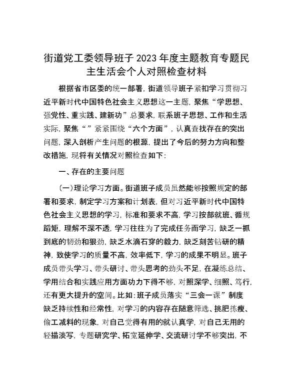 街道党工委领导班子2023年度主题教育专题民主生活会个人对照检查材料 2024-01-11 Word模板 128 购买前,请一定要先点击这里看看,欢迎持续关注,精彩模板每天推送 预览结束,本文件为word文档,一共7页,共3138字,请购买后,下载后查看 购买前,请一定要先点击这里看看,欢迎持续关注,精彩模板每天推送 资源下载下载价格29 RMBVIP免费升级VIP点击检测网盘有效后购买有任何充值和下载问题请加微信:xuexixuexi66 0 党课及生活会