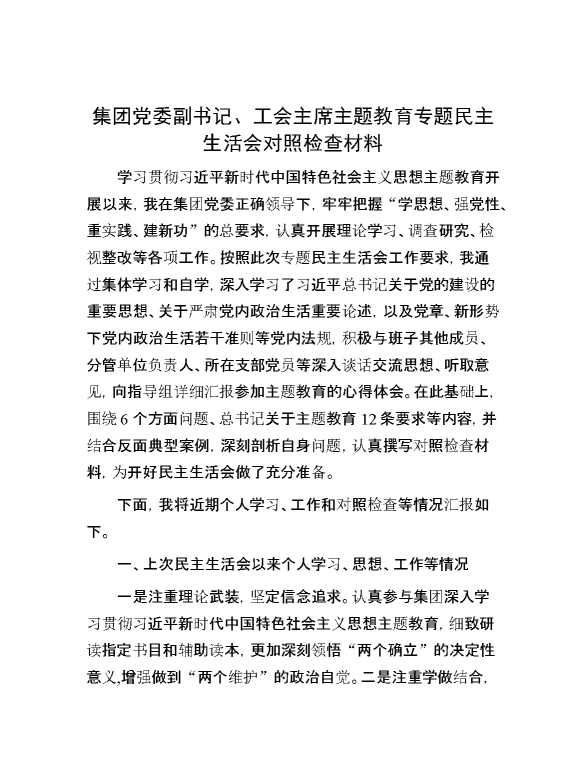 集团党委副书记、工会主席主题教育专题民主生活会对照检查材料 2024-01-11 Word模板 134 购买前,请一定要先点击这里看看,欢迎持续关注,精彩模板每天推送 预览结束,本文件为word文档,一共7页,共3164字,请购买后,下载后查看 购买前,请一定要先点击这里看看,欢迎持续关注,精彩模板每天推送 资源下载下载价格29 RMBVIP免费升级VIP点击检测网盘有效后购买有任何充值和下载问题请加微信:xuexixuexi66 0 党课及生活会